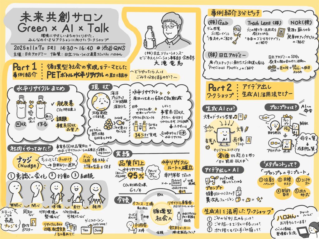 2025年11月7日に、東京・渋谷で株式会社日立アカデミー主催のリアルイベント「未来共創サロン Green × AI × Talk~環境に配慮したまちのつくりかた、みんなの小さなアクションに向けたワークショップ~」が開催されました。このイベントは"環境×まちづくり"をテーマに、協賛・賛同する各社のさまざまな取り組み事例が紹介されたほか、環境に関連する生成AI活用術も学べるプログラムも用意。企業の枠を越えて多様な視点や経験を持つ仲間との交流や発見を通じて、持続可能な未来への意識を高める興味深いワークショップとなりました。そこに日立ソリューションズが運営するコミュニティ「ハロみん」も協賛の形で参加。PETボトル水平リサイクルを普及させるための社内の取り組みをご紹介しました。