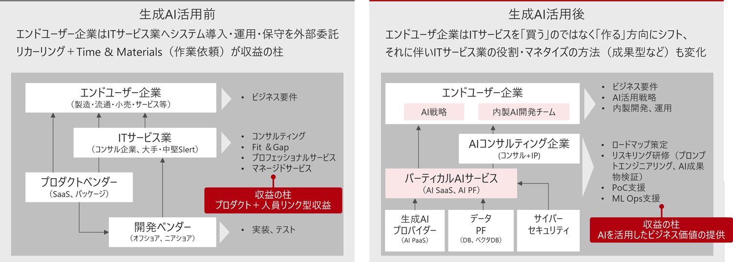 エンドユーザー企業はこれまでITサービス業へシステム導入・運用・保守を外部委託していましたが、今後はソフトウェアを買うのではなく作る(内製化の)方向にシフト。生成AIの普及に加え、バーティカルAIも数多く登場したことで、ソフトウェア開発の容易化が進み、エンドユーザー企業は自前のAIソリューションを構築する方向に傾きつつあるということです。