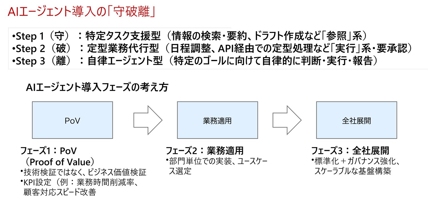 そこで、AIエージェント導入の3ステップと導入フェーズの考え方を紹介しました。北林はAIエージェント導入ステップに「守破離」という考え方を取り入れています。またAIエージェント導入には3つのフェーズがあるといいます。