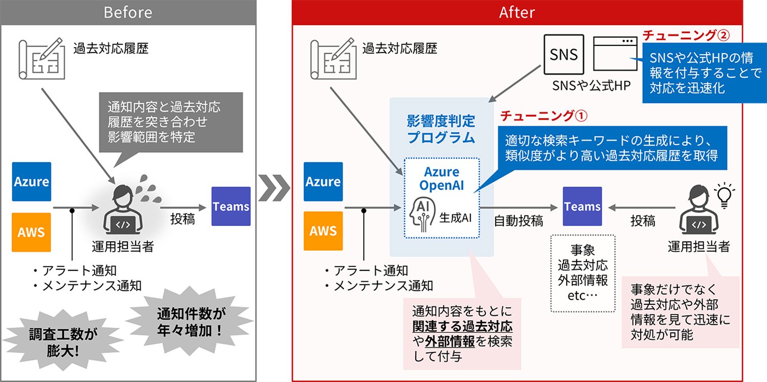 2件目は、クラウド監視アラートの高度化事例です。クラウド環境(Amazon Web Services/Microsoft Azure)からの膨大なアラートをAIが分析した上で、過去の対応履歴と照合し、重要度判定と一次切り分けを自動化。その結果、運用担当者の負荷軽減と障害対応の迅速化につながりました。