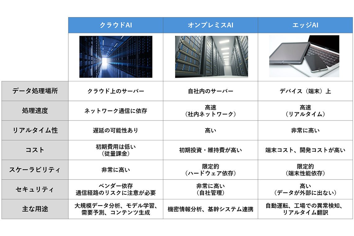 AIをビジネスに導入する際、学習や推論の処理をどこで実行するかは、極めて重要な戦略的判断になります。選択肢を大別すると、クラウドAI以外に「オンプレミスAI」と「エッジAI」があり、それぞれ異なる特性と最適な用途が存在します。