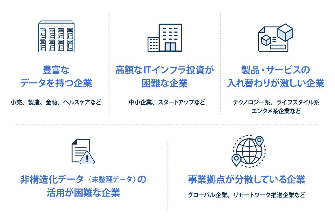 クラウドAIはあらゆる企業に恩恵をもたらす可能性があります。特に、以下のような特徴を持つ企業・組織は大きな成果を期待できます。