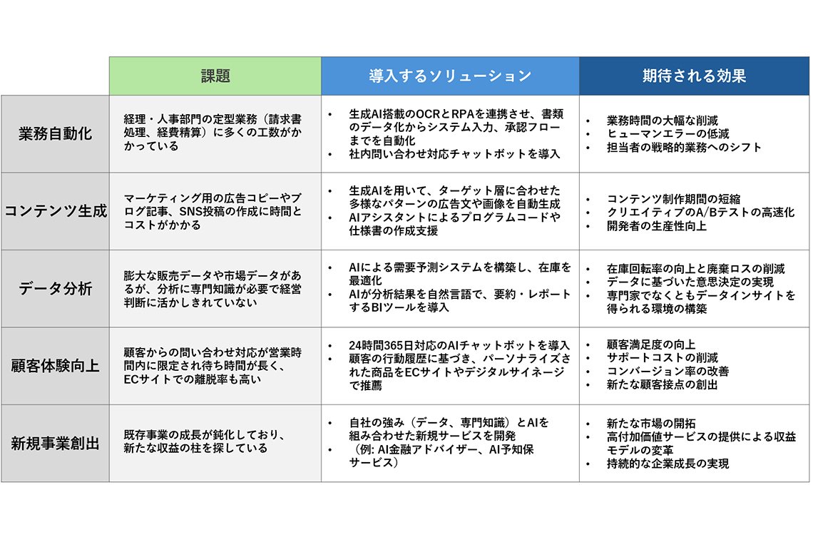また、構造化されていないデータの活用に課題を抱える企業。社内に散在する文書、マニュアル、メール、議事録といった「非構造化データ」の活用に悩む企業。生成AIを搭載した企業内検索や要約ツールは、これらの埋もれた知識資産を価値に変える力を持っています。