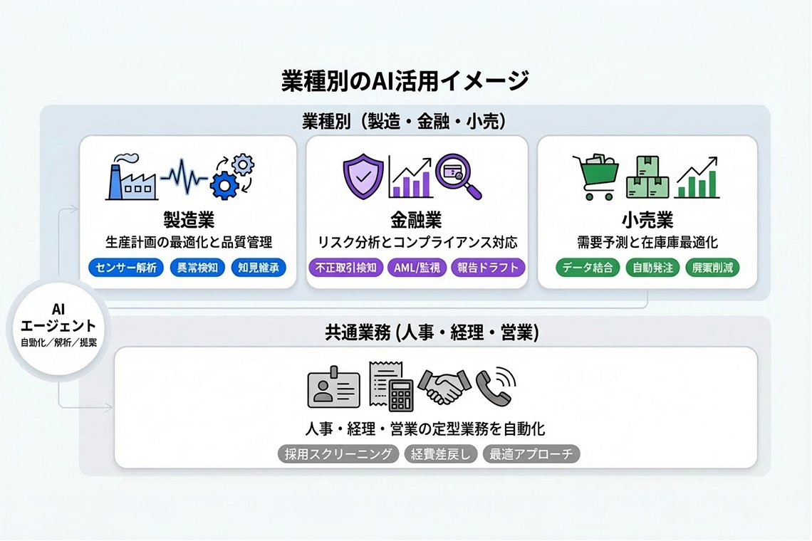 人的リソースを最適化して時間とコストを削減できる点は、AIエージェントのメリットです。ここでは、企業におけるAIエージェントの活用イメージを、業種別・部門別で見ていきましょう。