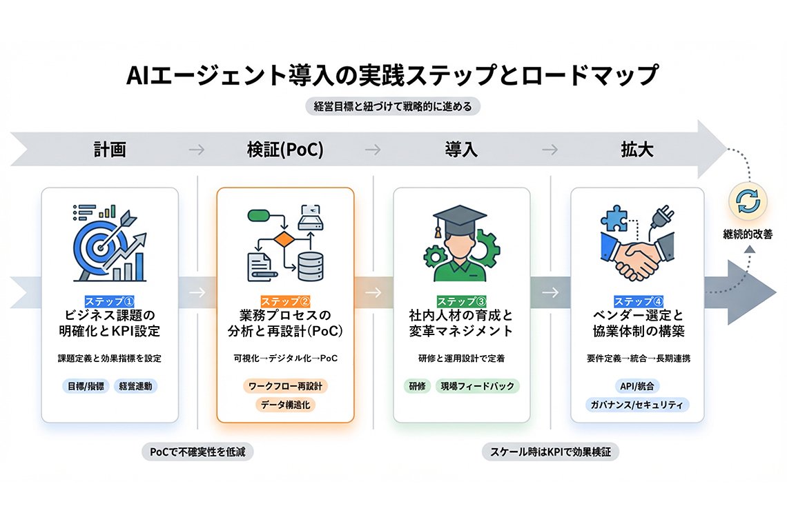 AIエージェントを「パートナー」として使いこなすためのリテラシー教育を並行して行いましょう。失敗を許容し、AIと共に試行錯誤を繰り返すマインドセットこそが、中長期的な競争優位性を生み出します。