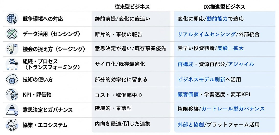 DXの本質は、単なるITツールの導入ではなく、激変する環境に適応するための「企業変革」そのものです。ダイナミックケイパビリティはこの変革を推進するエンジンとして改めて注目されています。