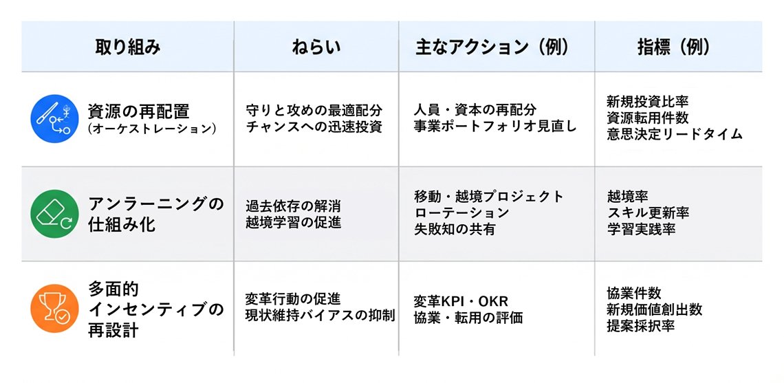 既存事業(守り)と新規事業(攻め)では、求められる論理が異なります。経営層の役割は、単にビジョンを示すだけでなく、既存事業の反対を押し切ってでも、変化の兆し(センシング)に合わせてヒト・モノ・カネを大胆に移動させる「資源の再配分」を断行することにあります。
