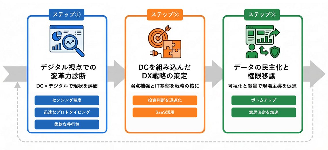 現場が感知した変化を経営層が迅速に判断できるよう、ダッシュボード等で情報を共有し、現場にも一定の裁量を与えることで、組織全体のダイナミックケイパビリティをボトムアップで高めていきます。DXとは、技術を通じて「全員が変革の主体になれる状態」を作るプロセスでもあるのです。