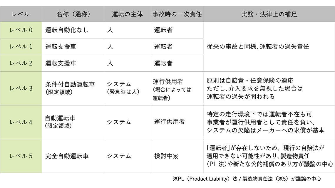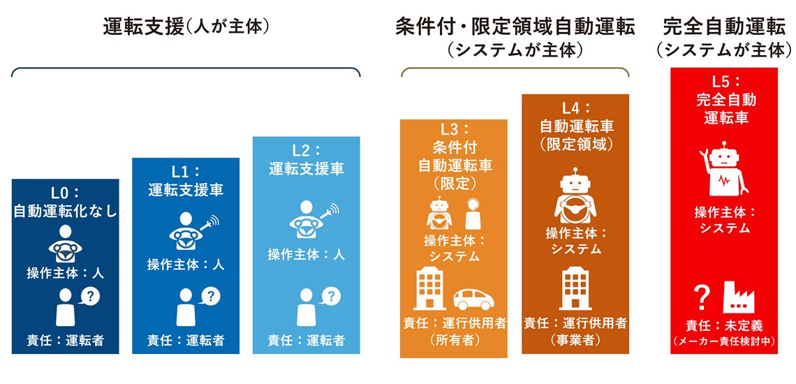 レベル2までは、あくまでシステムは「運転支援」にとどまり、事故時の責任は基本的に運転者にあります。