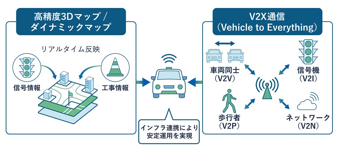 自動運転の高度化には、車両単体の技術進化だけでなく、それを支える社会基盤の整備が欠かせません。ここでは、技術面と社会実装の両面から、特に重要なポイントを整理します。