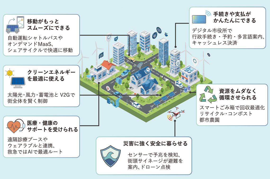また、スマートシティの価値は、過疎化が進む地方都市や超高齢社会において、より大きく発揮されるでしょう。遠隔医療や自動運転が高齢者の「移動の自由」を支え、見守りセンサーやインフラの自動点検が、限られた労働力でも都市機能を維持する環境づくりにつながります。