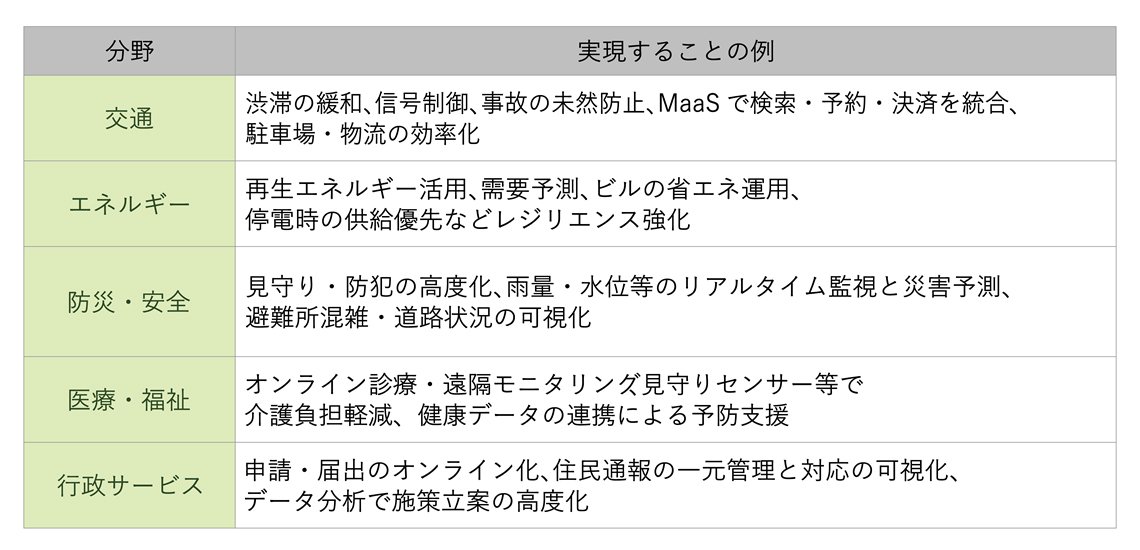 スマートシティで対象となる領域は幅広く、例えば各分野で下記のようなことが実現します。