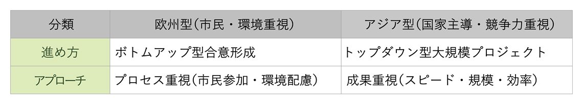 欧州では、スマートシティの取り組みに対してテクノロジーの導入そのものよりも「市民の合意形成」と「環境負荷の低減」を優先する傾向にあります。つまり、「市民が納得した上で都市をどんなルールで運用するか」を丁寧に設計しやすい点が特徴です。