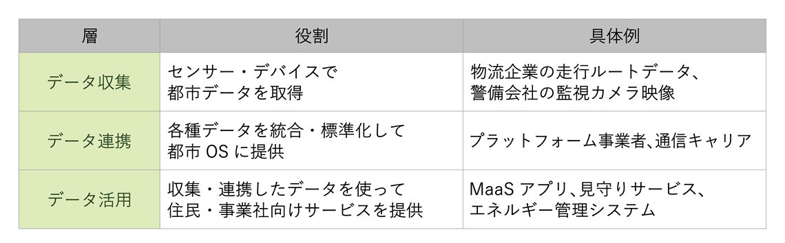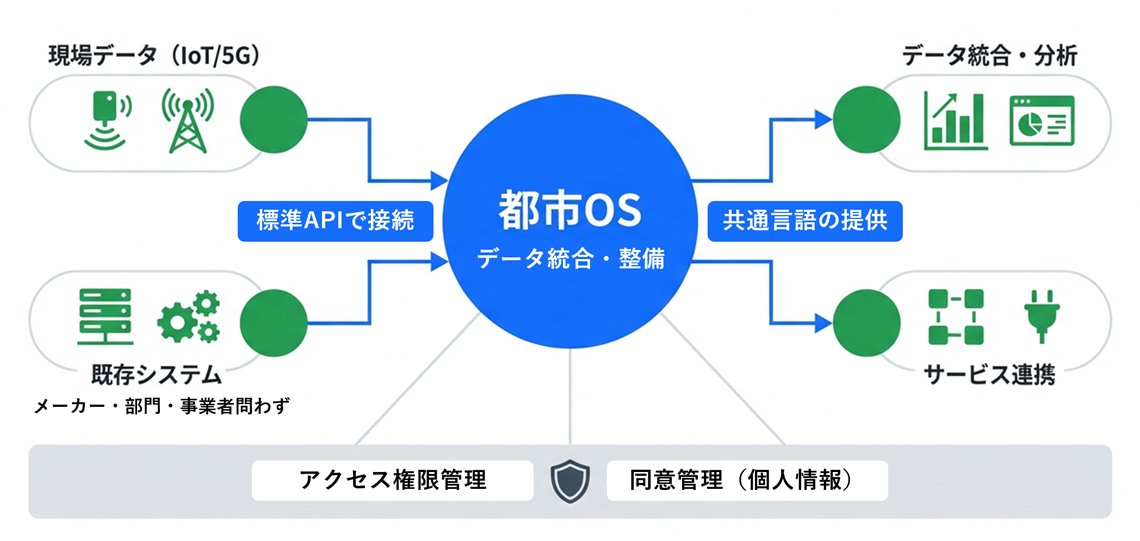 収集したデータを統合・活用する中核となるのが「都市OS」です。都市OSは異なるメーカーのシステムや異なる部門や事業者同士でもデータがやり取りできる標準APIで接続し、分析やサービス連携に活かせる形に整える「共通言語」を提供します。さらに、アクセス権限の管理、個人情報利用への同意管理など、都市データを安全に運用するための仕組みを担います。