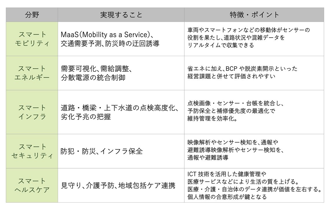 都市OSを活用した具体的なサービスは、分野ごとに実装が進んでいます。主要な領域を以下に整理しました。