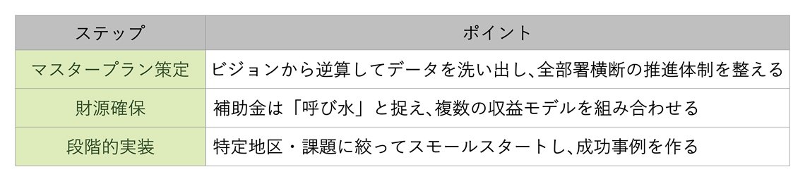 特に官民連携では、解決すべき都市の課題とKPI(例:移動時間、CO2削減、窓口待ち時間、出動回数など)を明確にした上で、スモールスタートで効果を検証しながら段階的に拡張するアプローチが現実的でしょう。