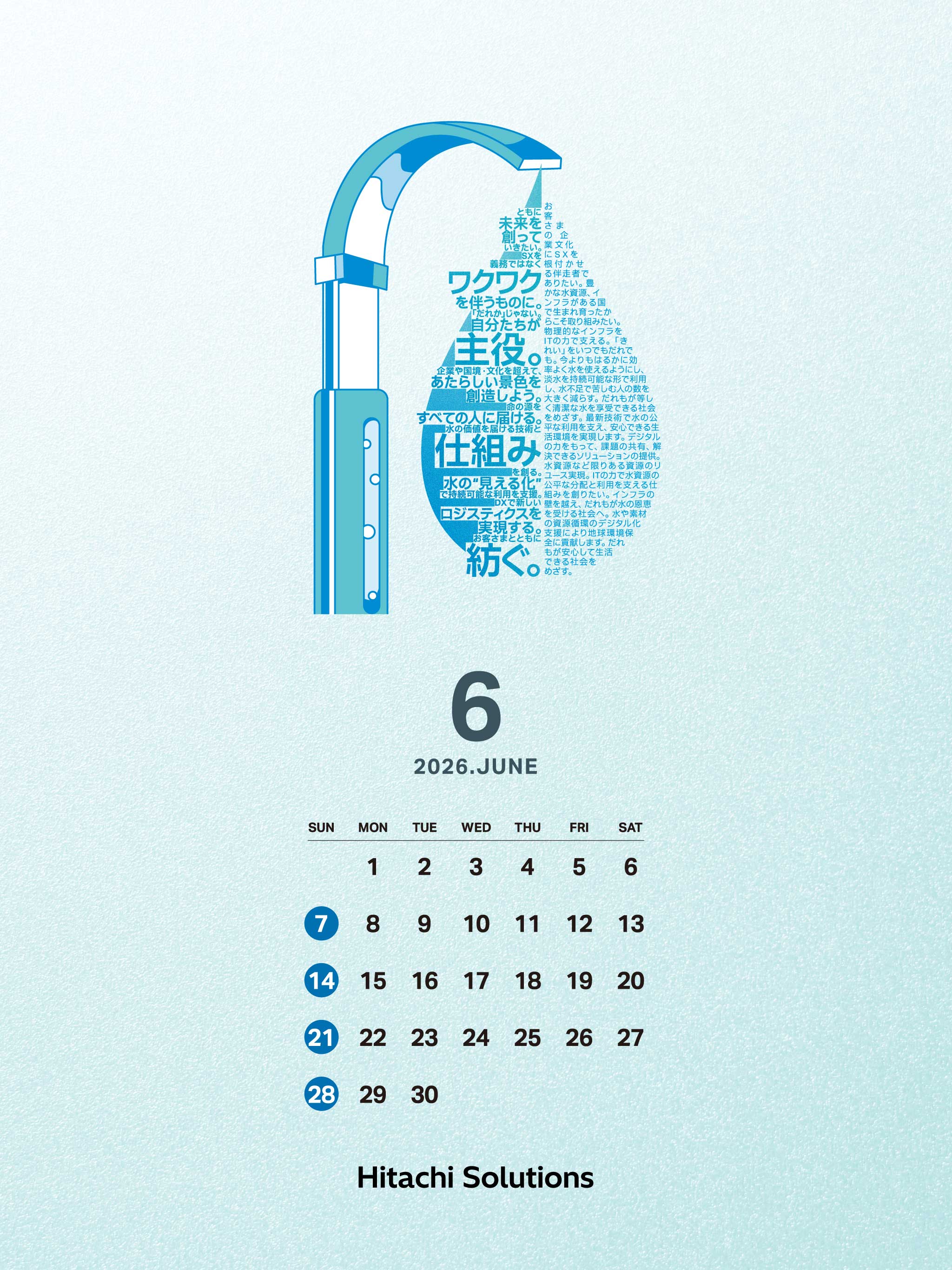 このカレンダーを制作するにあたり、日立ソリューションズの社員がSX(サステナビリティ・トランスフォーメーション)について意識していることや、ステークホルダーの皆さまへ伝えたいメッセージ、2030年の未来で提供したい価値をアンケートで収集。社員ひとりひとりの声を、各月ごとのテーマに合わせてデザインしています。社員が日々どのような思いで皆さまと向き合っているか、また、ひとりひとりが考える未来の世界や、叶えたい想いについて、ぜひ細部までご覧いただけますと幸いです。
