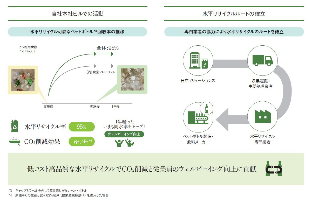 日立ソリューションズ本社では、社員参加型の仕組みづくりによるペットボトルの水平リサイクルに取り組んでいます。キャップ・ラベルを外したり飲み残しゼロを促すことで、水平リサイクルに適したペットボトルの回収率は27%から95%へ大幅改善しました。取り組みの裏側には、どのような工夫や挑戦があったのでしょうか。