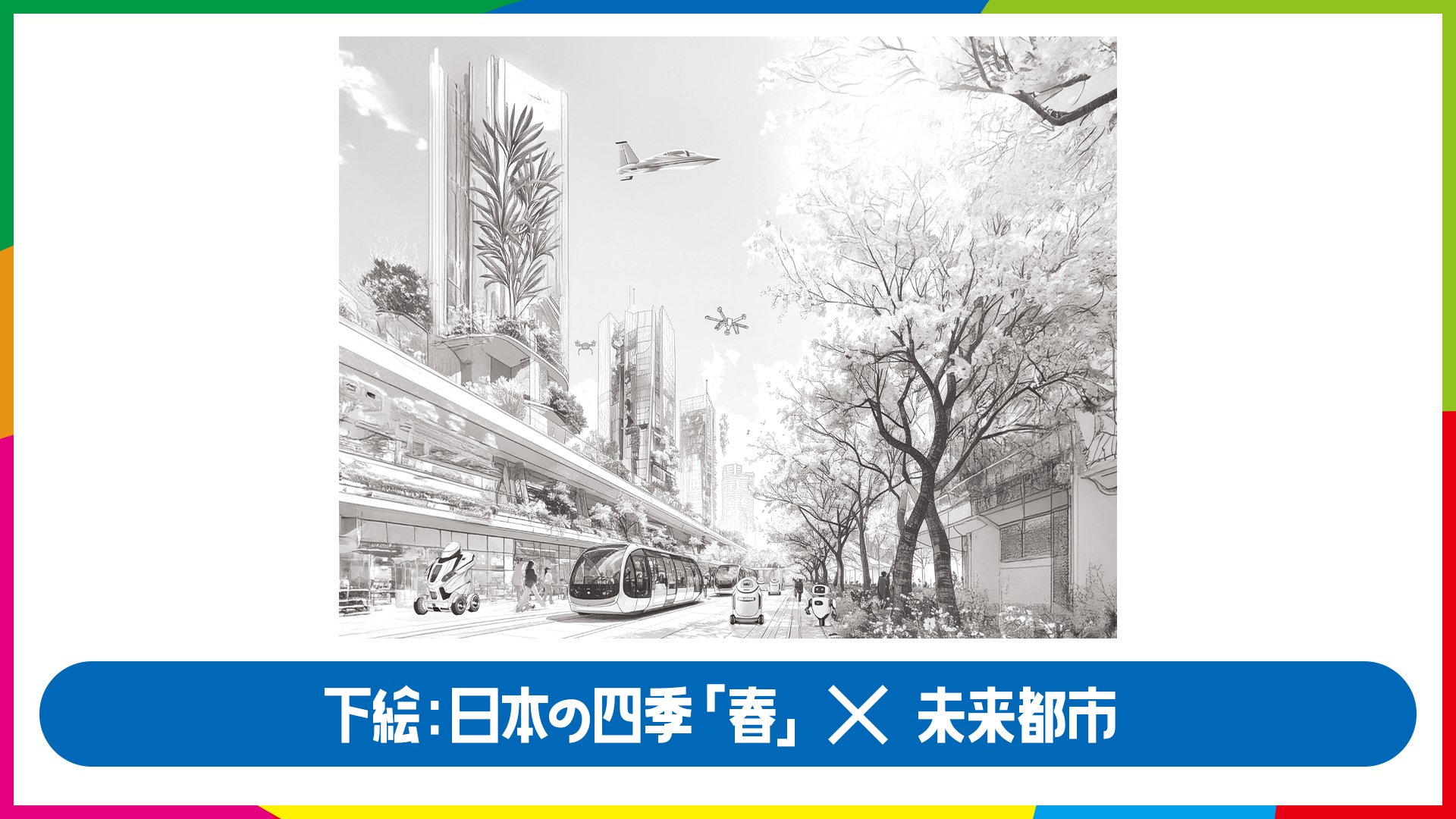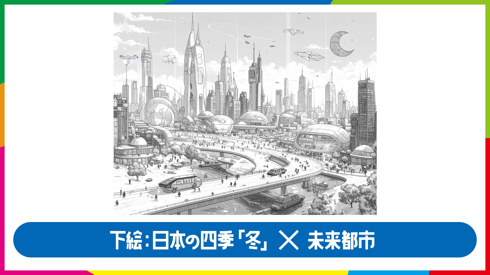 そうしてできあがった、2050年の未来都市の線画イラストがこちらです。